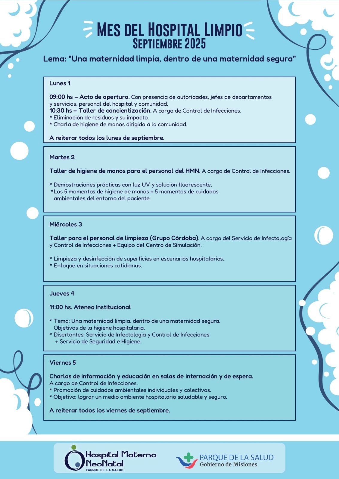 El Hospital Materno Neonatal celebra en septiembre el Mes del Hospital Limpio, una iniciativa destinada a fortalecer la cultura del cuidado y la higiene en todos los ámbitos de la institución. Bajo el lema 2025 “Una maternidad limpia, dentro de una maternidad segura”, se desarrollará un programa de actividades que busca concientizar, capacitar y acompañar a toda la comunidad hospitalaria en la construcción de un entorno más saludable.